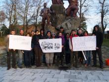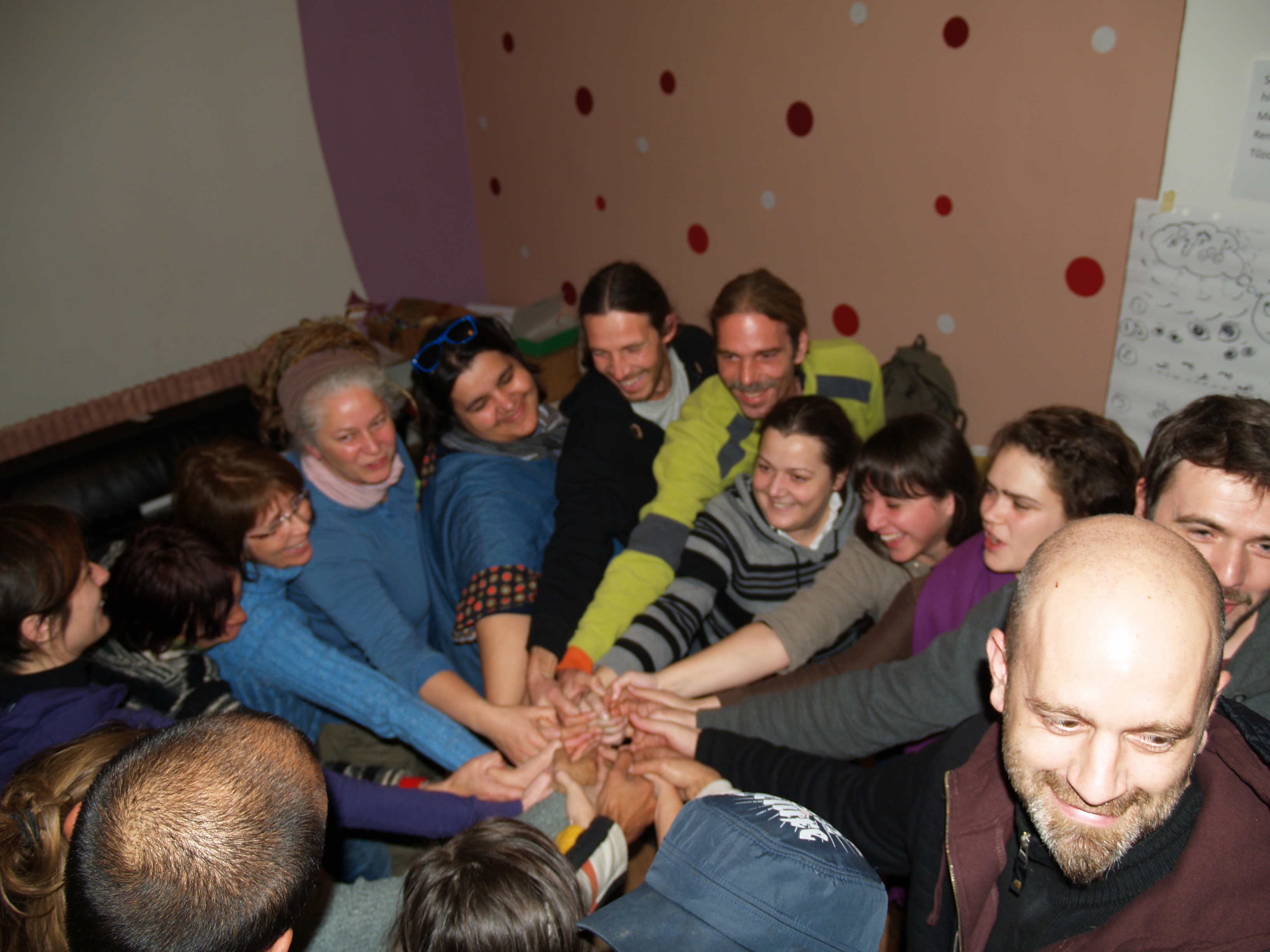 Pár dolog mostanában alakul, úgyhogy erről műhelymunkák formájában gondolkodtunk, beszélgettünk. Egyrészt Gibbon a belső átalakulás ügyét karolta fel: a jövőben igyekszik azon munkálkodni, hogy az átalakulással foglalkozók kapjanak teret az érzelmeik megértéséhez, feldolgozásához, kezeléséhez. Elmesélte, mire jutott idáig és átbeszélték együtt a témát. Bérces Dóri a jobb külső kommunikáció érdekében tartott kupaktanácsot, Feldmár Nóri és Lacziné Timi pedig a COP21-re szánt üzenetünk elkészítésének stratégiáját dolgozták ki a műhelymunkásaikkal és aztán az egész csapat kivonult a Hősök terére egy közös fotóra a stencillel, és a kész „transzparensekkel”. Szó esett arról is, miért fontos a hangunkat hallatni ebben a fontos témában.