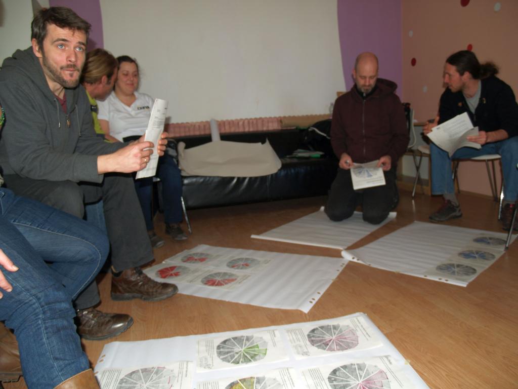 Vasárnap átnéztük, mire jutottunk szombaton, mi mindenről is esett szó. Aztán a jövőtervezéssel folytattuk, amely az elismerő feltárásban a következő lépés. Négy jövőkép állt össze a gyors-lassú energiacsökken(t)és tengely és a kíméletlen-kíméletes klímaváltozás tengelyek adta lehetőségek mentén: a legrosszabb felől haladtunk a legjobb felé. Ebben a pozítív átalakulás jövőképben vertünk sátrat, el is mélyültünk benne egy rövid gyakorlat segítségével. Majd lezártuk a témát és egy újat nyitottunk.