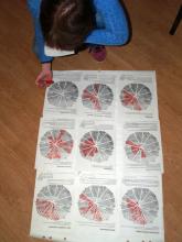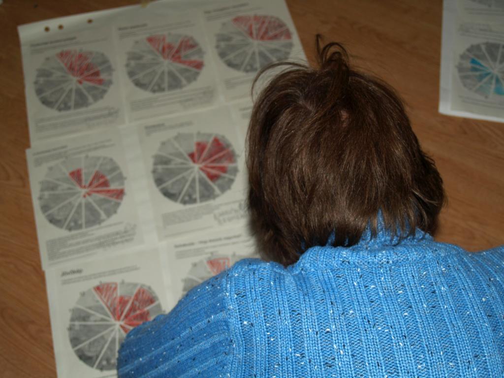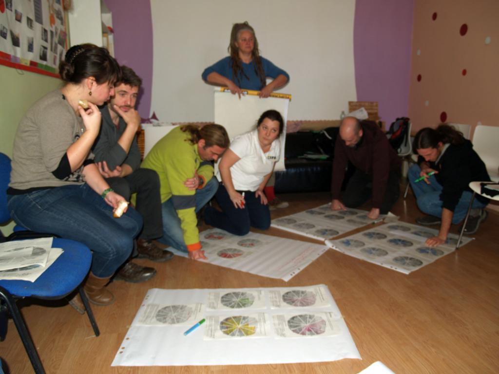 Aztán szakértő mozaik szisztémában megismertük az elismerő feltárás lényegét, folyamatát. Majd kaptunk a virágokhoz hasonló ábrákat: mindegyik sziromhoz egy-egy kérdés tartozott, s a közösségünkre vonatkoztatva satíroztuk, hogy szerintünk mennyire megy jól ez a dolog nekünk. Majd a kész papírokra rápillantva kitűnt, mi az, amit nagyon vagányan tolunk. Aztán ezeket a klassz témákat átbeszéltük párokban, s később elmondtuk nagy körben is a lényegét a többiek előtt. Ezt a módszert hazavisszük, s nyilván a közösségünkkel is megcsináljuk a sziromszínezést!