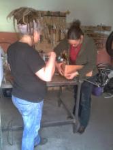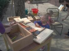 Kicsik és nagyok, lelkesen csiszolták a faanyagot és készítették a gilisztalak két szintjét, az alapozást, a fedelet és a díszítéseket. Igazi manufaktúra hangulat lett.