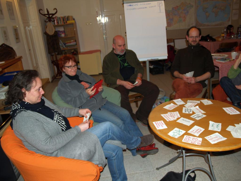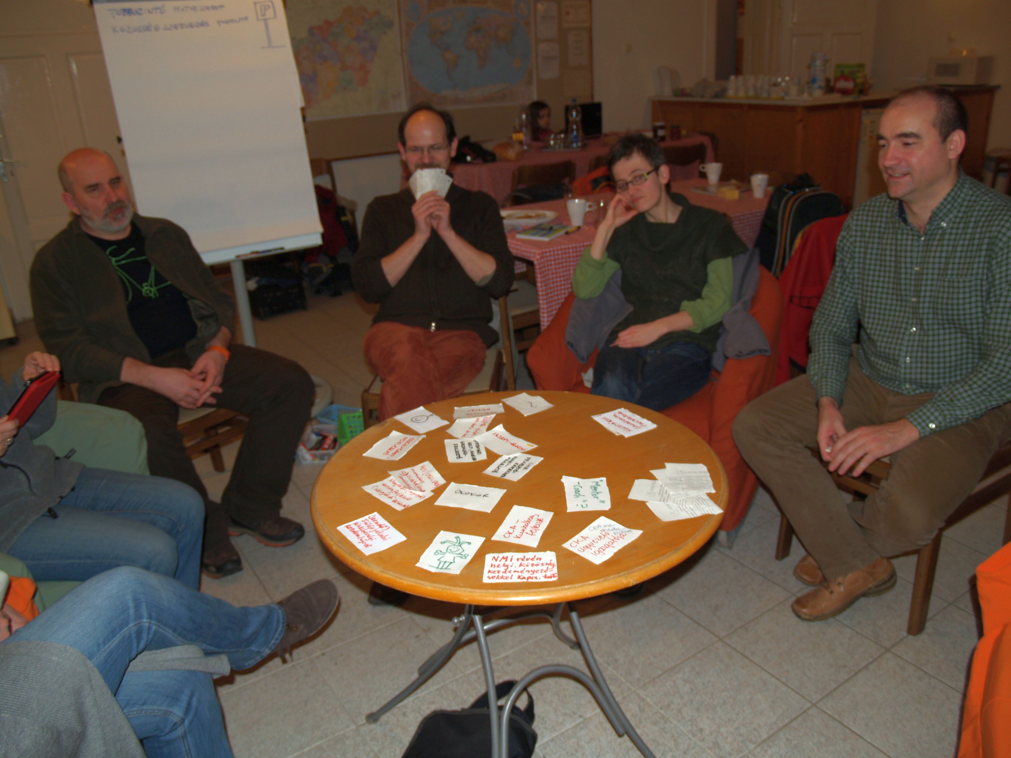 Ez a harmadik ilyen összejövetel volt, eddig a leghosszabb és legtartalmasabb találkozó. Addig ismerkedgettünk, most kezdtünk a konkrétumok irányába mozdulni, és ugyanakkor közelebbről látni egymást, összecsiszolódni. Az a jó egy alakuló csapatban, amikor biztos keretek között látjuk egymás kis furaságait, kóstolgatjuk egymás egyéniségét, egymás gondolatain kezdünk pörögni: akkor érezzük, hogy szellemileg fogunk ebből az együttlétből nőni, töltődni.