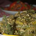 Ezért készült a kunbábonyi földben termett sütőtökből a csípős gyömbéres krémleves, mely a tél végén melegítő hatással van szervezetünkre. A tepsiben sült lilahagymás, paradicsomos bab igazi téli étel, vegáknak gazdag fehérjeforrás. A paradicsom, darált paprika, a fűszeres szósz, amivel összesült a közösségi kert termése, és a szövetkezeti tagok keze munkája. A szezámmagos zöldbab szintén a kertünkől származik: a tavalyi év csúcstermése, fűszerkerti kakukkfűvel. Az idénysaláta minden étkezés kihagyhatatlan eleme, főleg, ha a hozzávalók a leszedés utáni egy órán belül már a tányéron vannak (...ez most nem így történt, de majd nyáron...). A fokhagymás, citromos tepsis krumplival és a tzatzikivel egy kis görög hangulatot volt szándékunkban csempészni a résztvevők lelkébe.