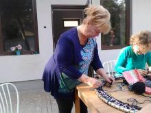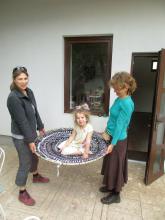 Örömünket a Soroksárról érkező „Jószomszédok” fokozták, akik azonnal belemerültek a fonalak készítésébe, majd a közös alkotásba. A karikát kézi horgolással kezdtük telíteni, kívülről befelé, előre kiválogatott fonalakból. Megint sokat gazdagodtunk a különböző anyagok tulajdonságairól szóló tudományban: természetesen tapasztalati úton tapasztalt asszonytól. Igen szorosra horgoltuk a szálakat, hogy majd ne nyúljon túlságosan a használat során. Ez a művelet komoly ujj-tudatosító gyakorlatnak bizonyult, de az alkotás izgalma felülkerekedett mindenen.