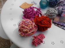 Ezen a derűs napsütötte délutánon Hosszúhetényben, a Hosszú Kávé teraszán kipakoltuk a gombolyagokat, amiket az első műhely alkalmával és az előző két hétben gyártottuk. Rengeteg ollócsattogással, több órás, napos kitartó fötrő tekeréssel átalakultak a ruhakupacok: gyönyörűséges retextil fonalakká váltak. Mintha mindegyiknek lelke lenne, amely olyan sok tényező által formálódik, folyamatosan változik. És végre eljött a pillanat, amikor a természetet óvó indítékokból fakadó sok munka gyümölcsének megszületésébe foghattunk. Közös döntés alapján fészekhinta és függőágy készítését tűztük ki mai célnak. Angéla szakmai javaslataira hallgatva egy hosszúhetényi vízszerelő mester készített nekünk egy vaskarikát, amely arany színű palástot kapott magára. Már az aranykarikának is hihetetlen vonzereje volt, de amikor a fonalak is képbe jöttek...